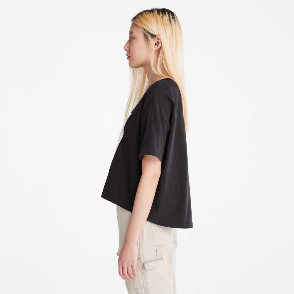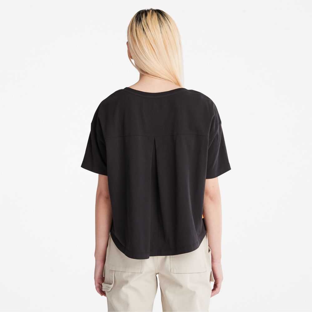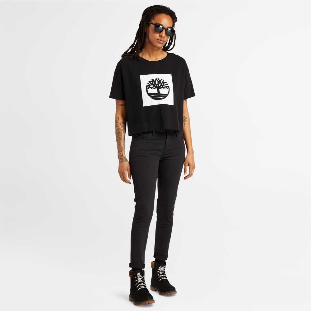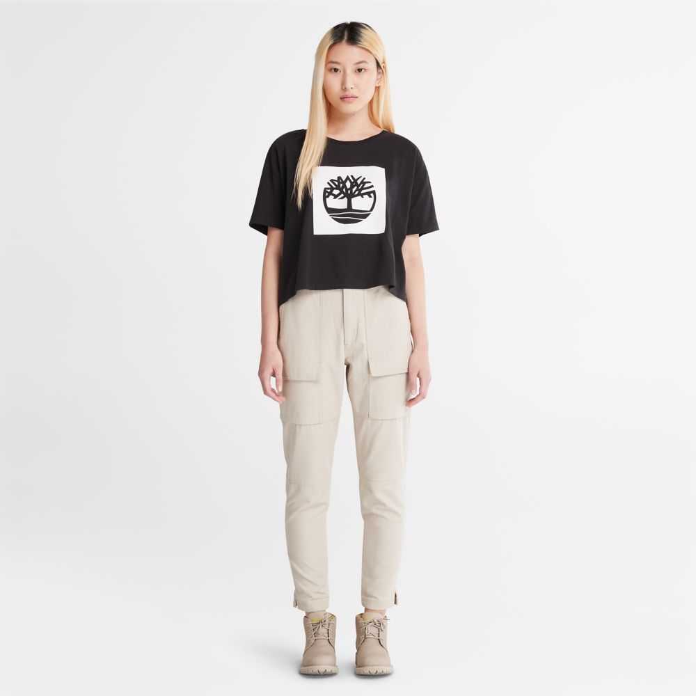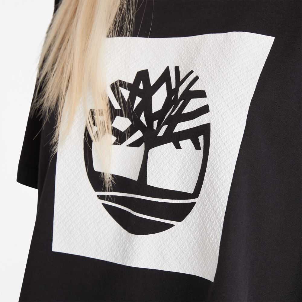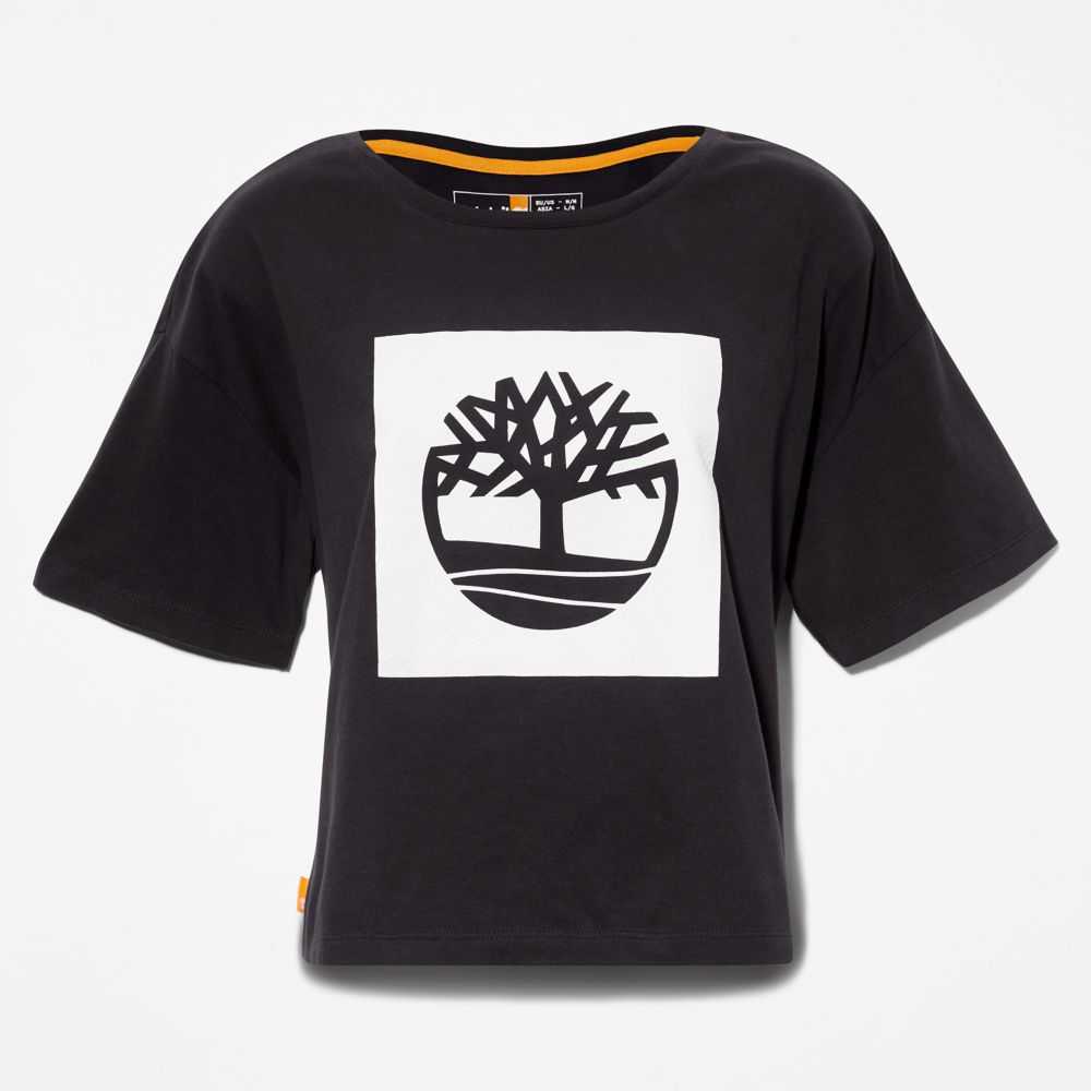 The Timberland tree logo on the chest gives a bold look to this cropped tee made entirely of cotton grown without harmful chemicals or pesticides.